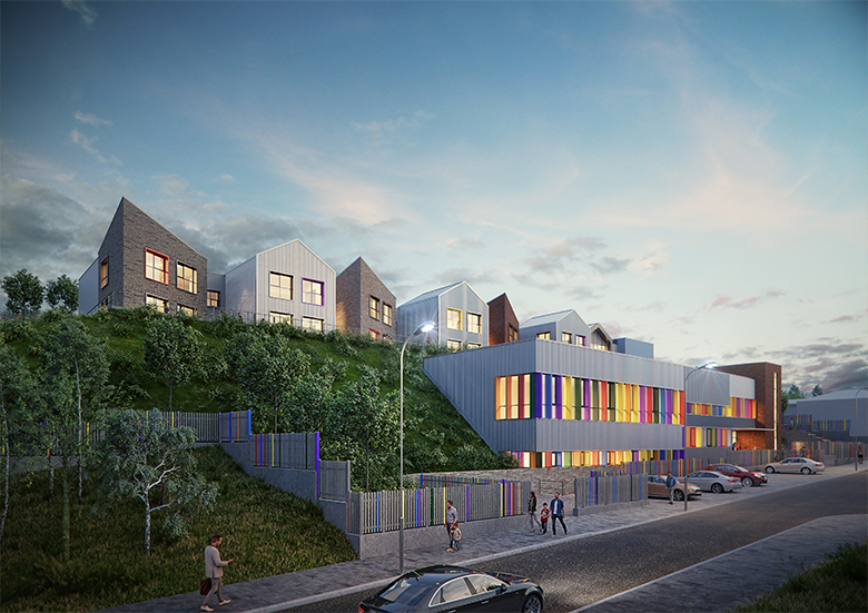 Формата на долната част на сградата е абстрактна, изградена от вертикали и хоризонтали, докато формата на горната част е изобразителна. Пряка асоциация с детска рисунка, горното крило определя цялостното образно въздействие на детската градина. Архитектурният…