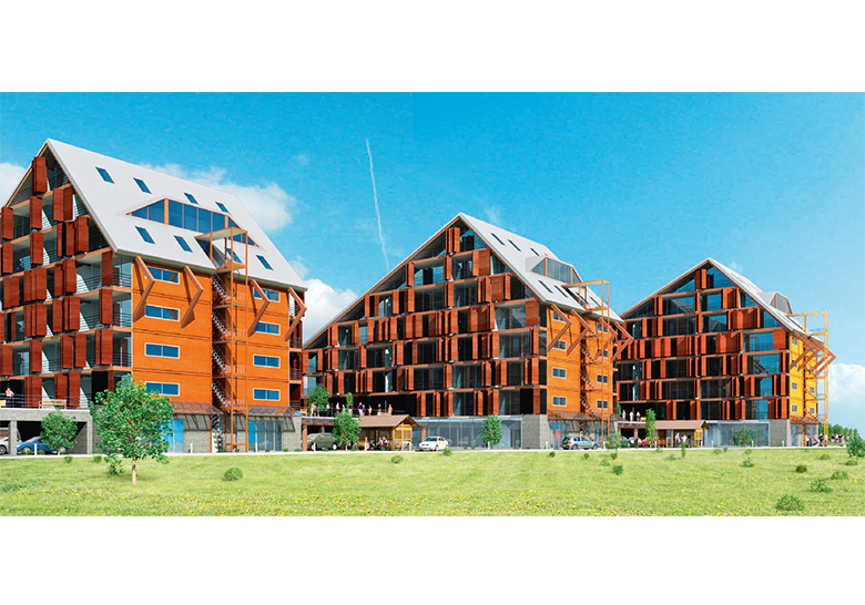 Три еднакви сгради с алпийски характер са свързани със скрита в земята платформа с рецепционно фоайе, сервизни и развлекателни пространства, басейн с подвижен покрив, фитнес и спа центрове. Във всеки блок има по 52 апартамента.