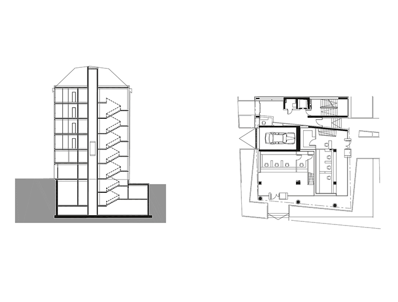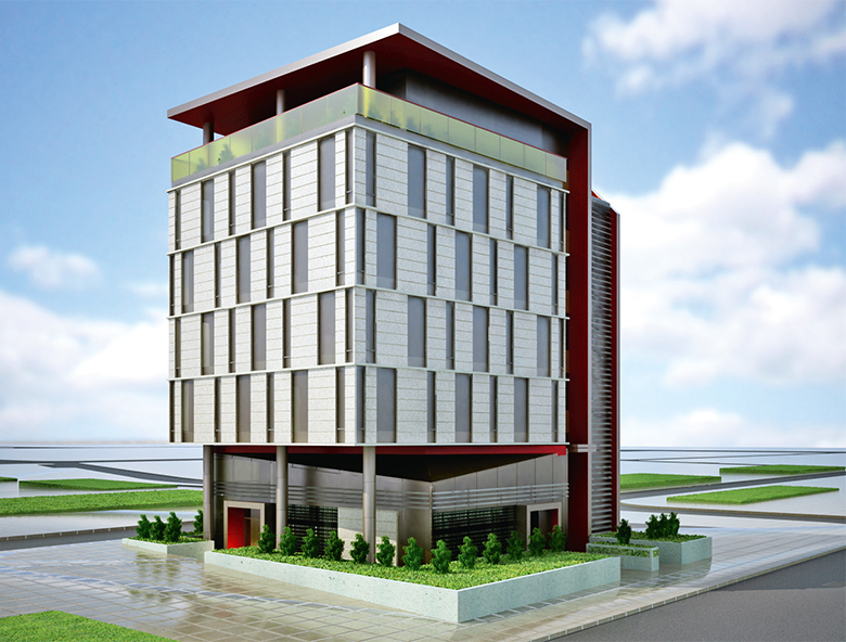 Седеметажната сграда разполага с банкови офиси с галерии в партера и офис площи в основния кубичен обем. В сутерена е разположен триредов автоматизиран гараж, достъпен с асансьор. Изчистената форма и фасадата от гранит и стъкло в равно съотношение определят мащаба, подходящ за значимата локация.