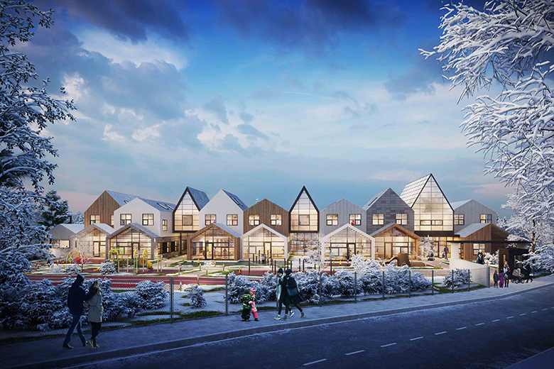 Основни идеи: Приказен силует и образ, свързан с детска рисунка Проява на пространствената структура чрез композиция от съчленени обеми и материали Преход от мащаба на съседните къщи към този на близките жилищни блокове Идеална ориентация…