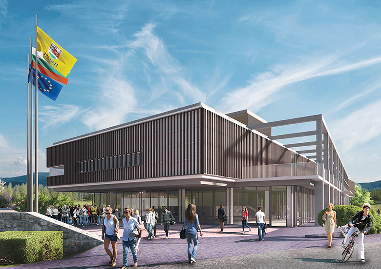 Архитектурната композиция се основава на компактен шестетажен симетричен обем – монолит с централно атриумно пространство, ориентирано по дългата ос изток-запад. Твърдостта на единичния обем съответства на градския контекст на кампуса, доминиран от сгради с прости…