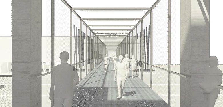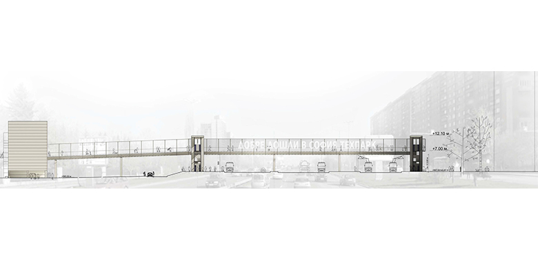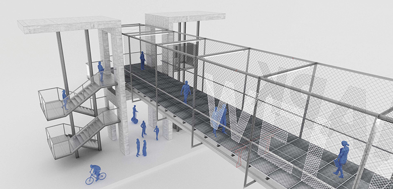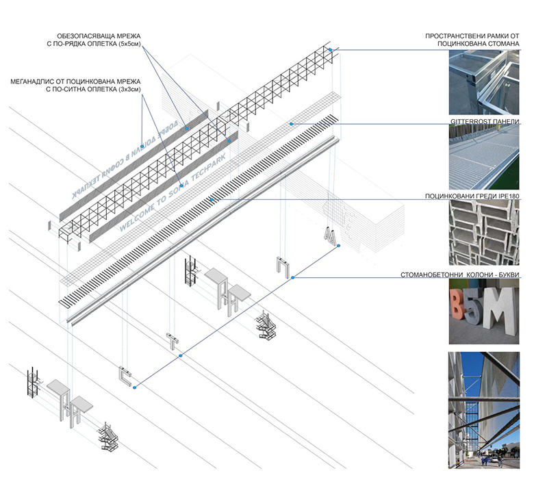 Основната цел на проекта е да се постигне изключително впечатляващ имидж на пасарелката при пълно спазване на предизвикателно ниския бюджет. Архитектурната композиция се състои от две части – основна – над булеварда и второстепенна – връзка към прилежащата сграда. Визуалната маса се постига чрез пространствена тръба от галванизирани стоманени рамки, обвити в галванизирана мрежа.