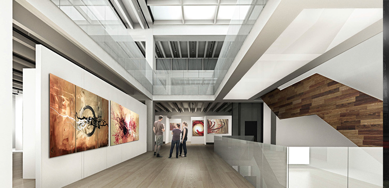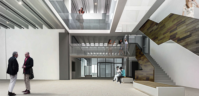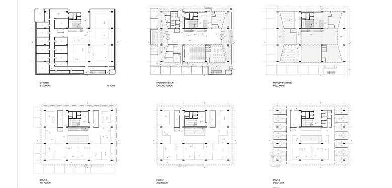 Конкурсът предлага цялостно пренареждане на пространствата и входовете на партерното ниво. Главният вход е разположен в средата на фасадата на улицата и води до голямо многофункционално фоайе, свързано вертикално с централното ядро. Обхващайки цялата дълбочина на парцела, фоайето се отваря към интимен южен двор с кафене. Фоайето може да се обедини със заседателната зала и по този начин да се свърже със страничната търговска улица, което позволява максимална активност и използване на партера като градско пространство.