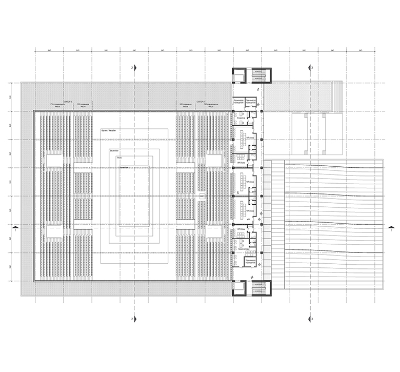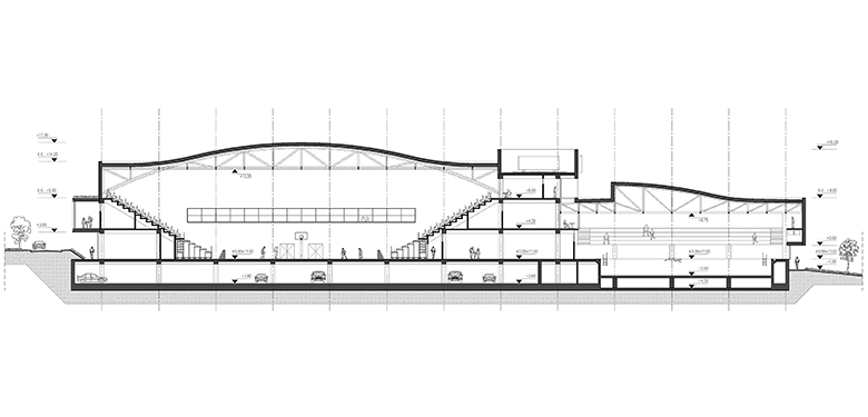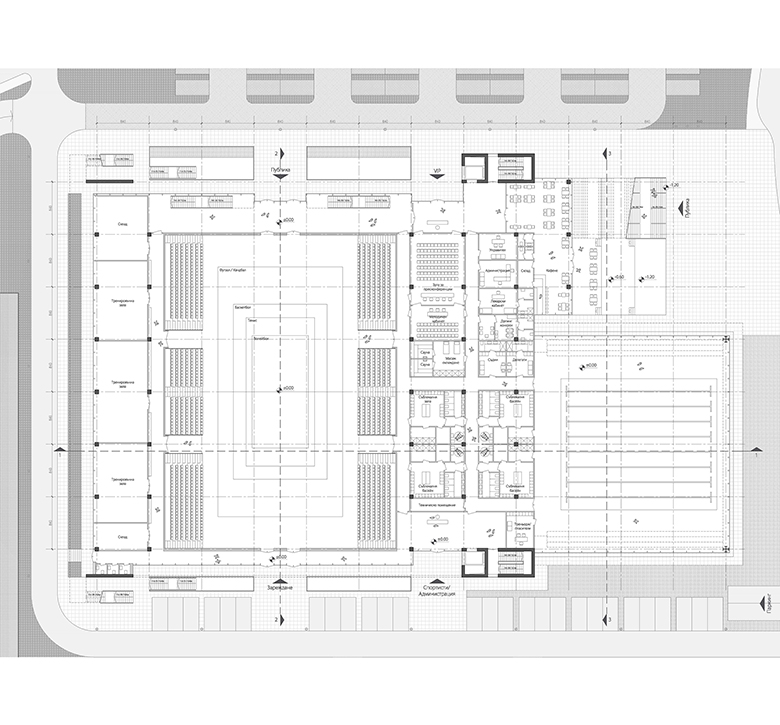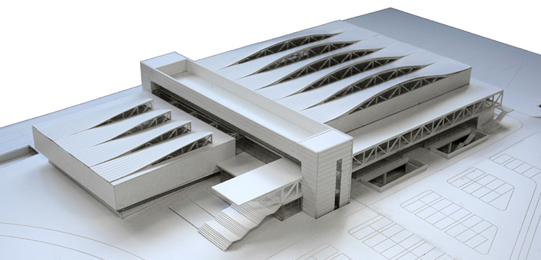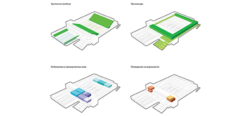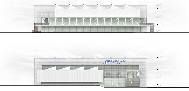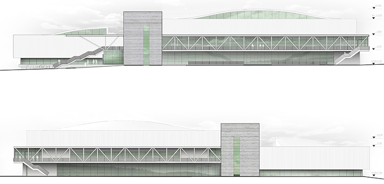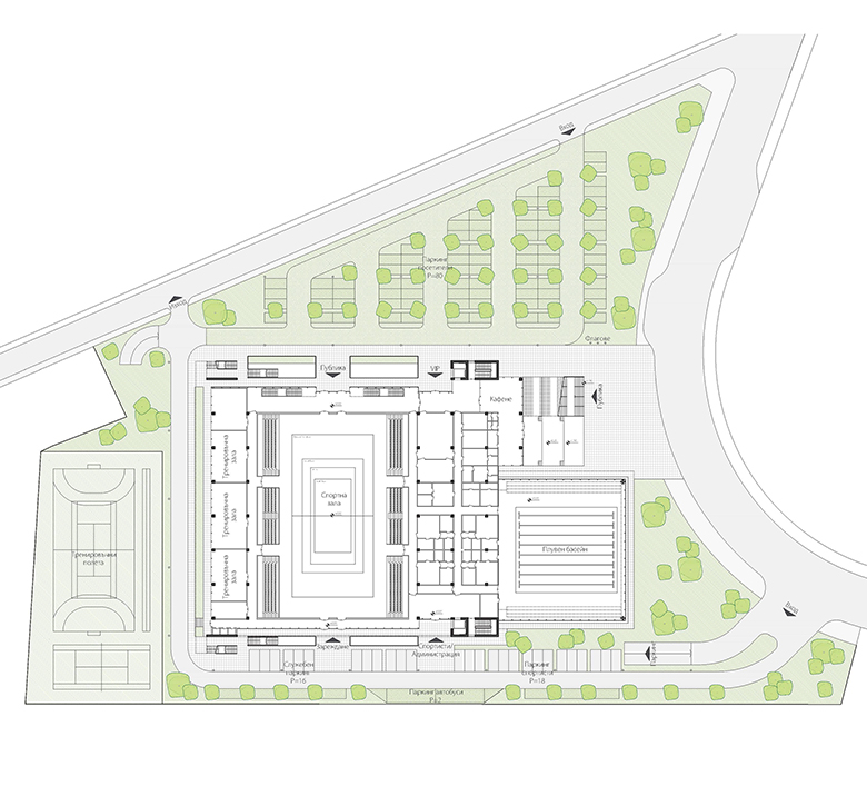 Основните обеми на спортната зала и басейна са ясно разчленени в архитектурната композиция. Тези обеми са свързани чрез сервизния модул, който действа като обединяващ елемент на проекта. В образа е вплетена морската тема, характерна за град Несебър. Основните материали също идват от местния контекст (каменна облицовка, окачени тавани и палуби от дърво). Свързан с морската тема, но и с климата на Несебър е белият цвят, позволяващ евтино, но и лесно за поддръжка решение.