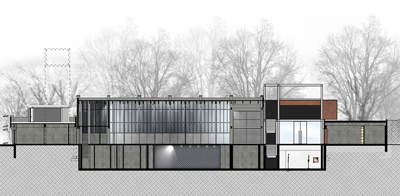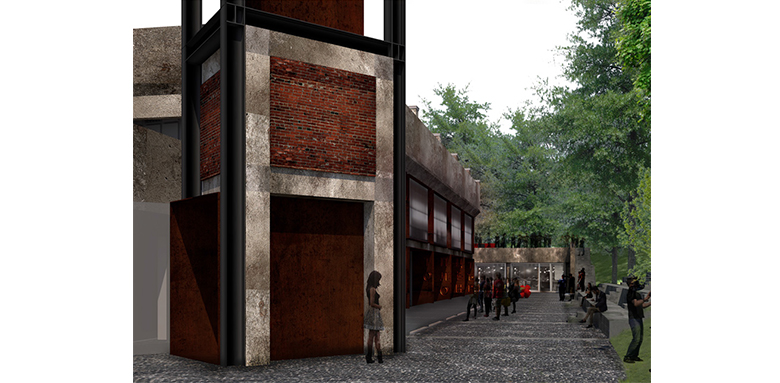 Основната идея на концепцията на проекта е да се запазят всички възможни конструктивни елементи. Запазени са повърхности с графити. Използват се стомана и леки индустриални материали. Новите пространства са кутии, поставени в съществуващата структура, докато структурните елементи само докосват съществуващата среда. Мобилните мебели осигуряват преконфигурируем интериор. Новият сутеренен етаж отговаря на кратките изисквания, като същевременно решава лошото състояние на долната конструкция на по-големия обем. Подът на по-малкия обем е повдигнат до нивото на входа. Всички пространства са многофункционални и лесно преконфигурируеми. Структурата се отваря както оптически, така и физически – вътрешните и външните пространства се сливат в едно пространство.