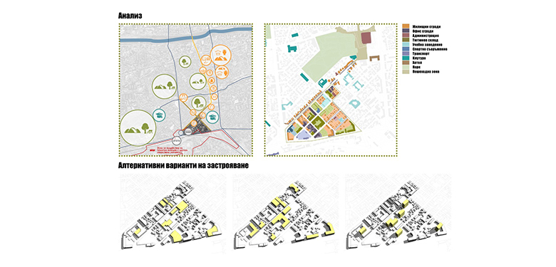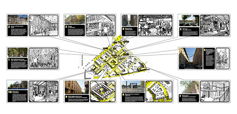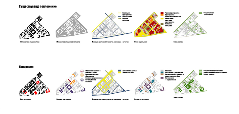 Проектът не предоставя конкретно решение, а по-скоро симулира подход и възможен процес на регенерация. Представени са симулация на градоустройствен анализ, оценка на алтернативни схеми, последвана от избор на синтезирана вариация. Горното се счита за основа за последващо градоустройствено планиране и процес на проектиране. Приложени са някои от най-съвременните техники, утвърдени в европейския опит: формулиране на насоки в процеса на проектиране; 3D план на сградата; брандиране на територията, като се вземат предвид емоционалните нагласи, поведенческите и субективните фактори.